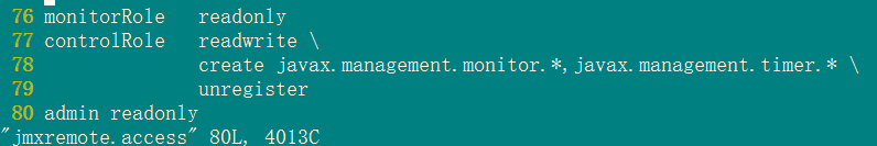 - jmxremote.access 添加用户 admin 并赋予只读权限, 文件末尾追加一行即可: admin readonly