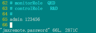 - jmxremote.password 中为admin 用户设置密码, 文件末尾添加一行即可: admin 123456